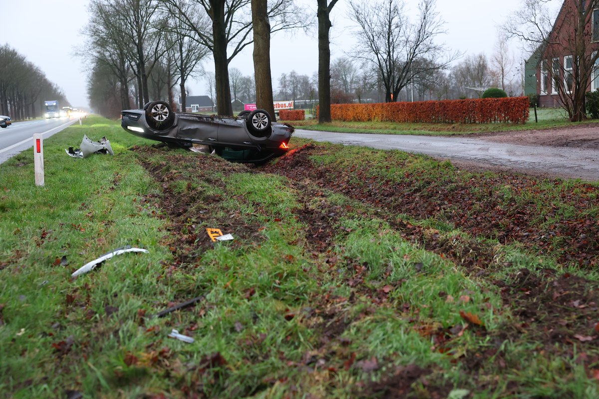Even na half acht gebeurde het ongeluk door onbekende oorzaak. Een auto belandde daarbij op de kop in een sloot. De bestuurder daarvan is met hoofdletsel naar het ziekenhuis gebracht. Het is onbekend hoe het met de andere betrokkenen is.