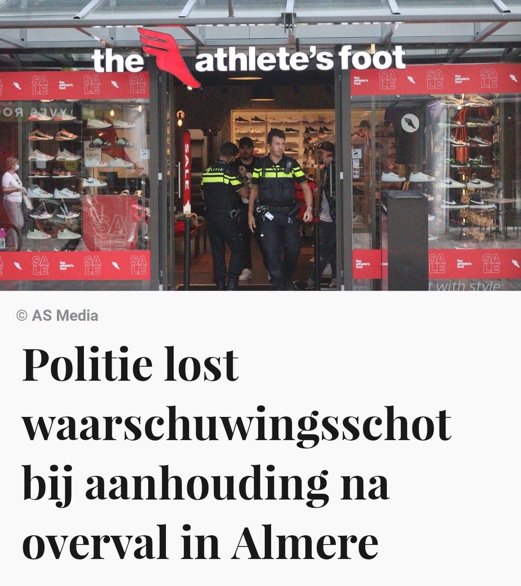 Schoenenwinkel The Athlete’s Foot aan de Stationsstraat in Almere is woensdagmorgen rond 11.00 uur overvallen. De politie loste een waarschuwingsschot bij de aanhouding.