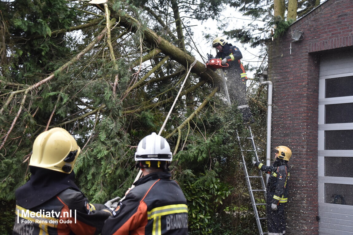 De brandweer zaagt de boom in stukken en zorgt dat het dak weer vrij is..