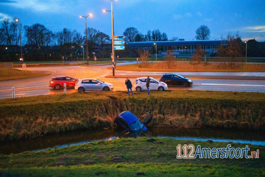Een automobilist is vermoedelijk de macht over het stuur verloren bij het verlaten van de rotonde en met zijn auto te water geraakt. Zover bekend zijn er geen gewonden gevallen. Een bergingsbedrijf heeft de auto uit de sloot gehaald en geborgen.