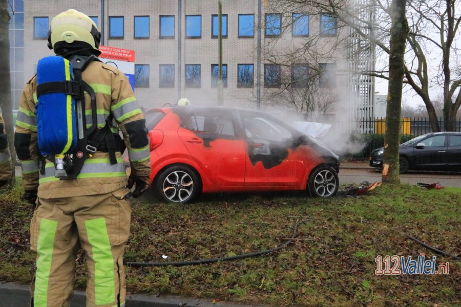 Een bestuurder is met zijn auto tegen en boom gebotst. Hierna is de auto in brand gevlogen en helemaal uitgebrand. De bestuurder is in een ambulance behandeld.