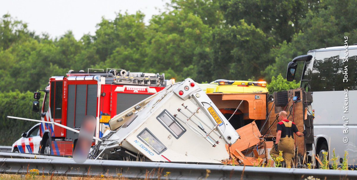 Ravage op de A50 nadat camper op zijn kant belandt, er vielen hierbij 3 gewonden, van de camper was niet veel meer over. Spoedmelding brandweer 20:23 P 1 BON-03 Ongeval wegvervoer A50 Li 208,9 Apeldoorn 069291 062431.