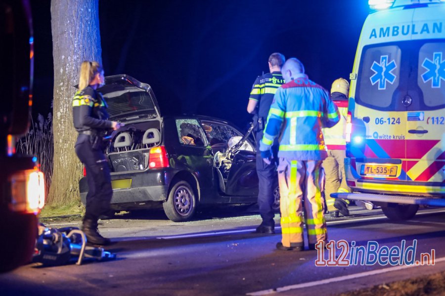 De man bostste door nog onbekende oorzaak tegen een boom. De brandweer zocht in het water nog naar een mogelijke tweede inzittende. Inmiddels is duidelijk dat de overleden man alleen in de auto zat.