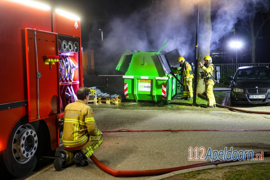 APELDOORN - Een beveiliger zag in de nacht van donderdag op vrijdag vier personen een container in brand steken naast een auto op een parkeerplaats aan de Zilverschoon in Apeldoorn. De container stond tegenover de Mheenhal, hier worden door de GGD vaccinaties gezet tegen het coronavirus.