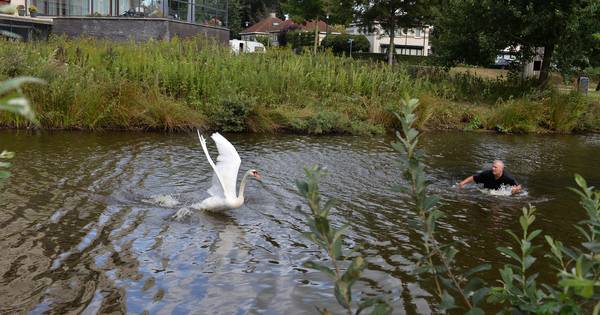 Het dier raakte in een water bij Het Verlaat verstrikt in een vislijn. Met behulp van buurtbewoners en een volleybalnet lukt het om de zwaan uiteindelijk te vangen en te helpen.