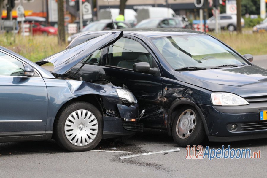 APELDOORN - Op de kruising Kayersdijk - Laan van Malkenschoten in Apeldoorn heeft zaterdagmiddag een aanrijding plaatsgevonden. Een Volkswagen kwam vanaf de Kayersdijk en wilde rechtdoor richting de A1. De Opel kwam vanaf de andere kant en wilde de Laan van Malkenschoten op rijden en werd op dat moment vol in de zijkant gereden. Een persoon, een jong meisje is in de ambulance onderzocht, evenals een vrouw. De toedracht van het ongeval, is een voorrangsfout. Een van de twee had rood licht. Beide auto's zijn fors beschadigd.