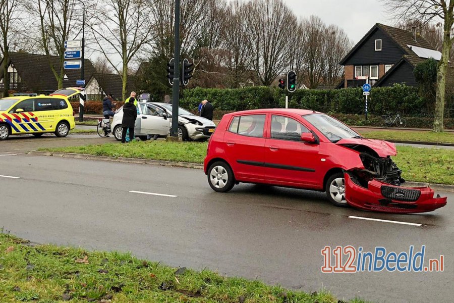 Twee personenauto's kwamen met elkaar in botsing waarna één van de auto's tegen een lantarenpaal tot stilstand kwam