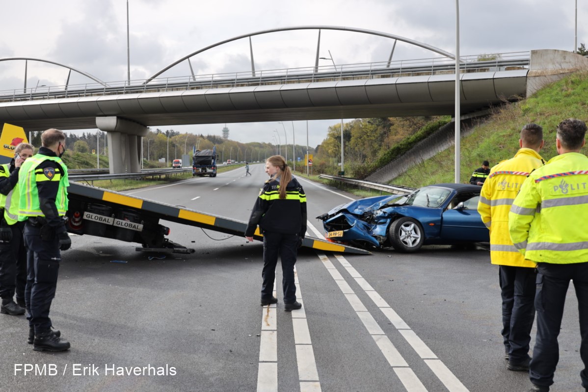 Zover bekend vielen er geen gewonden. Wel liepen de klassieke Jaguar en de vrachtwagen de nodige schade op. De Jaguar moest door een bergingsbedrijf worden opgehaald. De oorzaak van het ongeluk is niet bekend. De N261 was geruime tijd afgesloten. Foto’s: FPMB /Erik Haverhals.