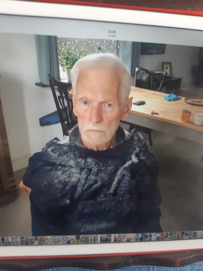 Hij is te herkennen aan grijs/wit haar, een donkergroene broek met zakken aan de zijkant, donkerblauw windjack met capuchon en een grijze polo.