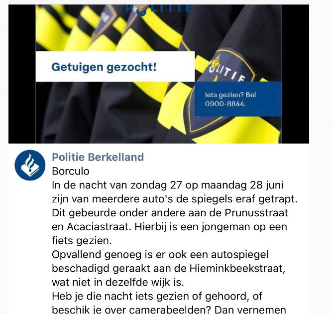 Borculo: Vandalen hebben zondagnacht auto's vernield. Prunusstraat, Acaciastraat. En uit de buurt: Hieminkbeekstraat. Politie zoekt getuigen, beelden. Zaaknr. 2021297385.