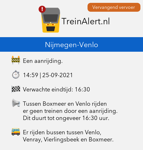 Tussen Boxmeer en Venlo rijden er geen treinen door een aanrijding.