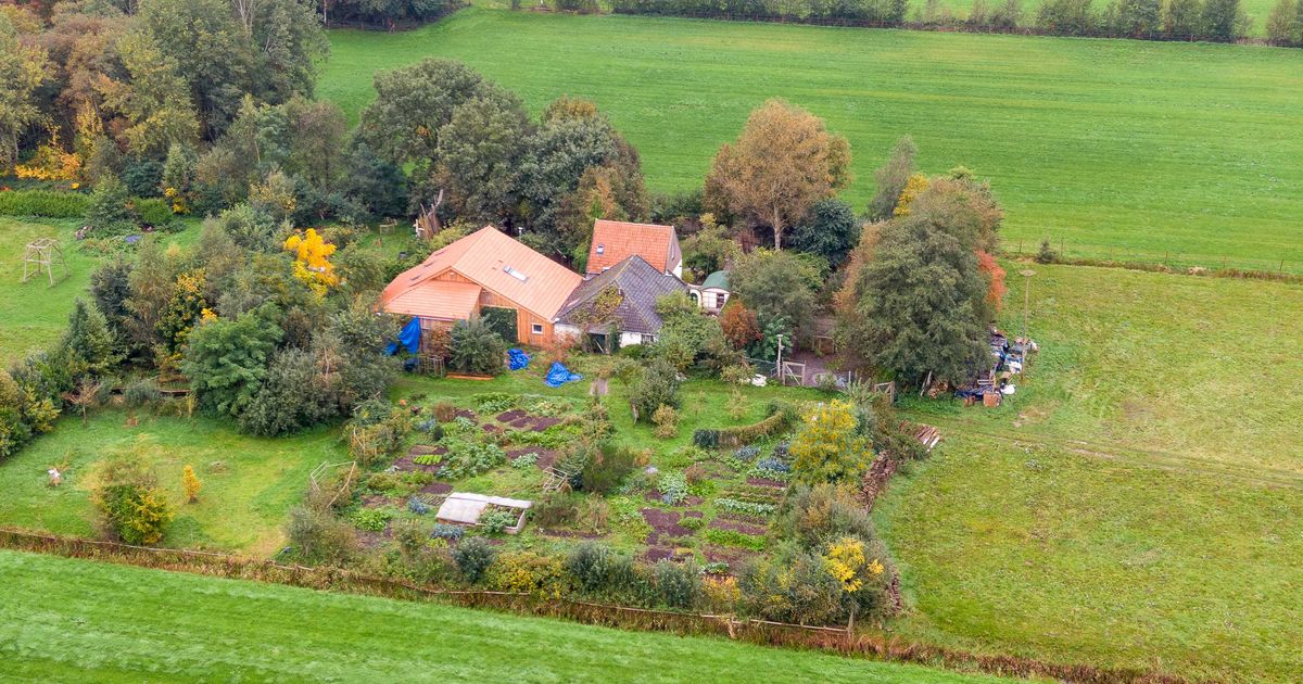 Een dronefoto van de boerderij aan de Buitenhuizerweg in Ruinerwold, waar zes mensen al jaren in de kelder woonde en wachten op 'het einde der tijden'.