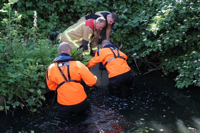 De brandweer werd gealarmeerd voor de melding; een dier in de problemen. Eenmaal ter plaatse troffen zij een aantal jonge eendjes aan die vast zaten in de duiker. Met een koevoet heeft de brandweer de eendjes kunnen bevrijden.