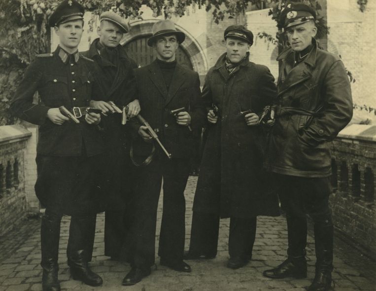 Piet Oberman (midden, met hoed) en Chris Hofing (rechts, politieuniform) op een foto uit 1945, kort na de bevrijding.