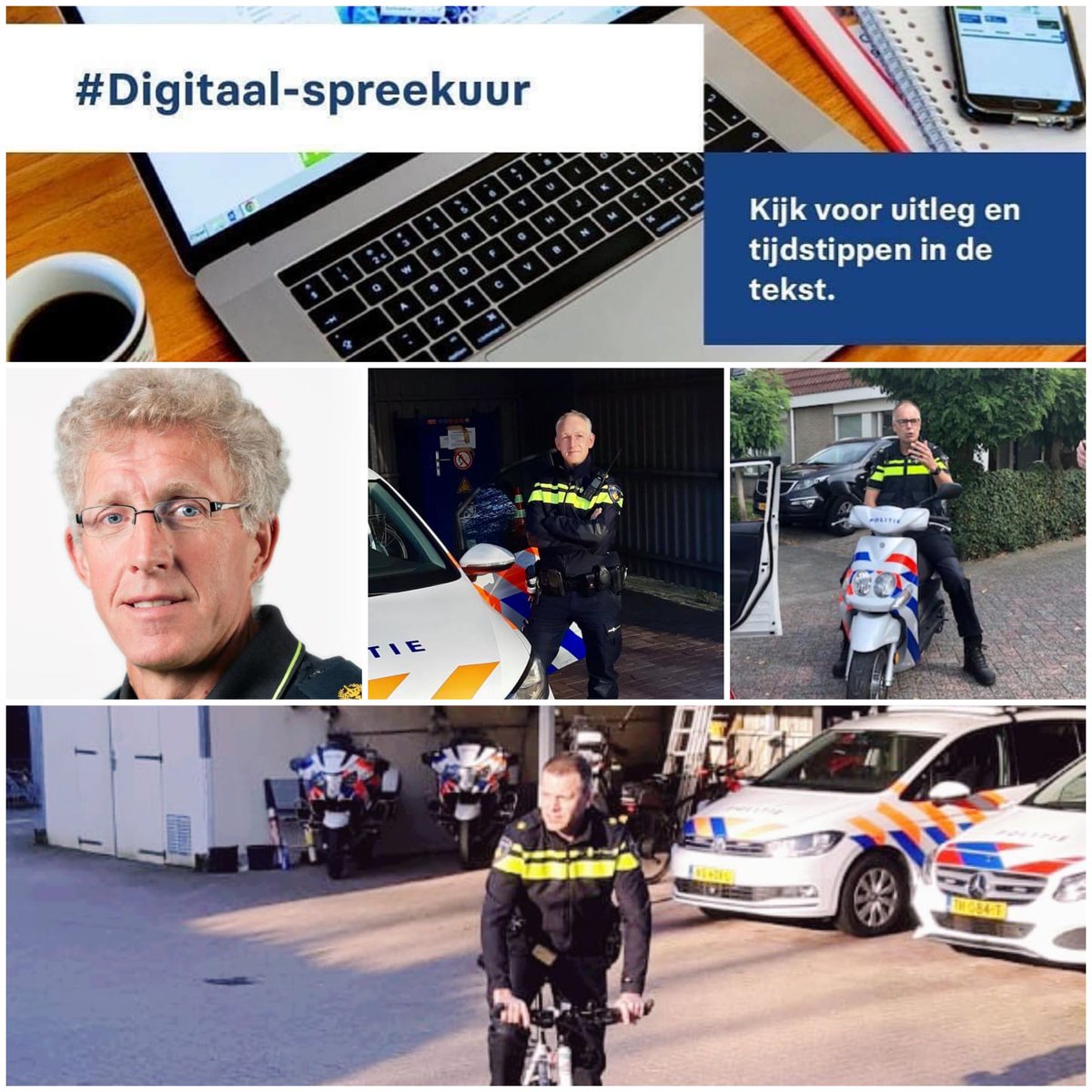 Vandaag werken deze wijkagenten voor u en zijn óók digitaal beschikbaar tussen 13.00 en 15.00 uur: Roland Kamps, wijkagent Dronten Zuid Gerard van Arendonk, wijkagent Swifterbant Arnold van de Kolk, wijkagent Dronten Noord en Zuid Jaap Glastra, wijkagent Biddinghuizen Spoed:112.