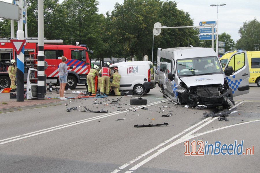 EMMEN - Op de kruising van de Abel Tasmanstraat en de Rondweg in Emmen zijn maandagmiddag rond half vier een taxibusje en een bestelwagen op elkaar gebotst.