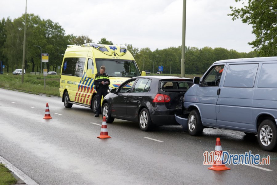 EMMEN - Op de Phileas Foggstraat in Emmen zijn dinsdagmiddag twee voertuigen met elkaar in botsing gekomen. Eén bestuurde raakte gewond.