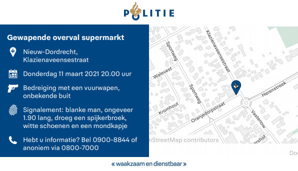 Nieuw-Dordrecht - Donderdagavond 11 maart is even voor acht uur een gewapende overval gepleegd op de supermarkt aan de Klazienaveensestraat. Een nog onbekende man kwam de winkel binnen om die tijd. Hij had een vuurwapen in zijn hand en bedreigde de caissière daarmee. Daarna ging hij er met een nog onbekende buit vandoor.