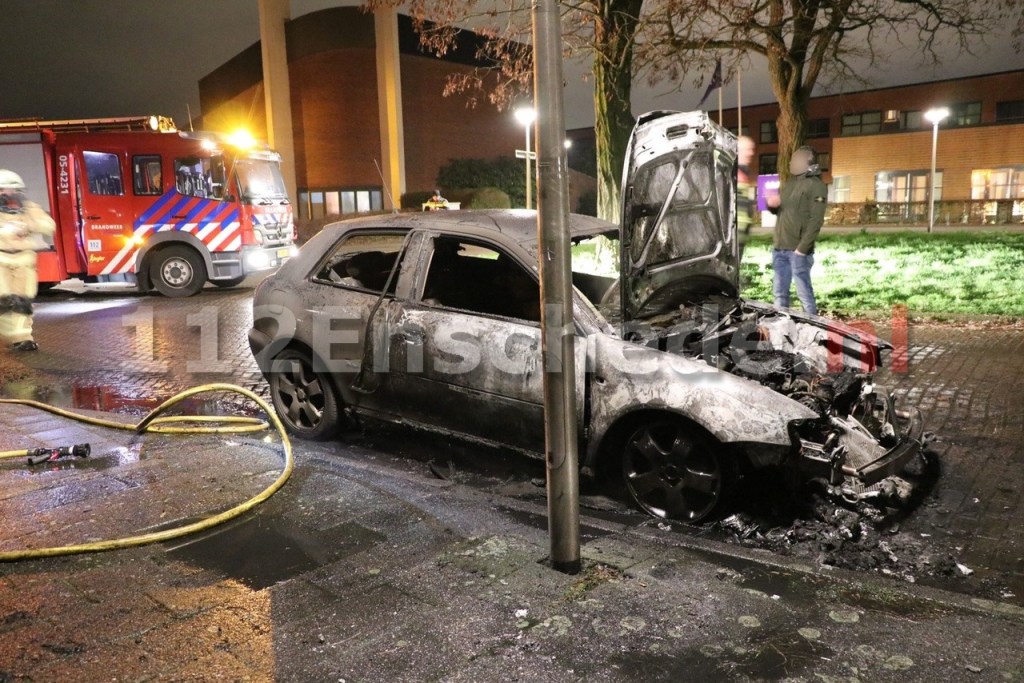 Auto verwoest door brand in Enschede, mogelijk brandstichting..