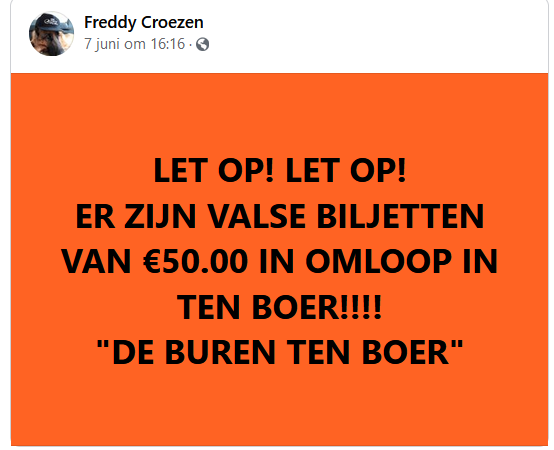Restaria de buren meldt dat er vals geld in omloop is in Ten Boer ????.
