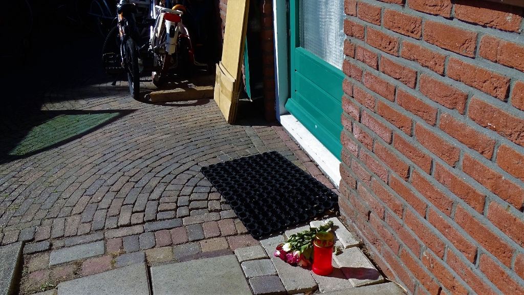 BUSSUM - Bij de woning aan de Nieuw Bellevue, waar zaterdag door vermoedelijk een misdrijf een vrouw om het leven is gekomen, zijn door omstanders bloemen en een kaarsje neergezet.