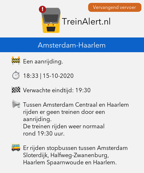 Tussen Amsterdam Centraal en Haarlem rijden er geen treinen door een aanrijding.