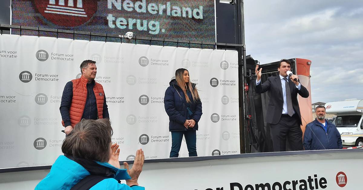 Geen Urkse taferelen op Parkeerterrein Havendijk in Harderwijk. Waar Forum voor Democratie-lijsttrekker Thierry Baudet dinsdag vele handen schudde en lichamen omhelsde, houdt de politicus zich tijdens zijn campagnebijeenkomst in Harderwijk een stuk beter aan de coronaregels. Toch verloopt de campagneochtend lang niet altijd coronaproof.