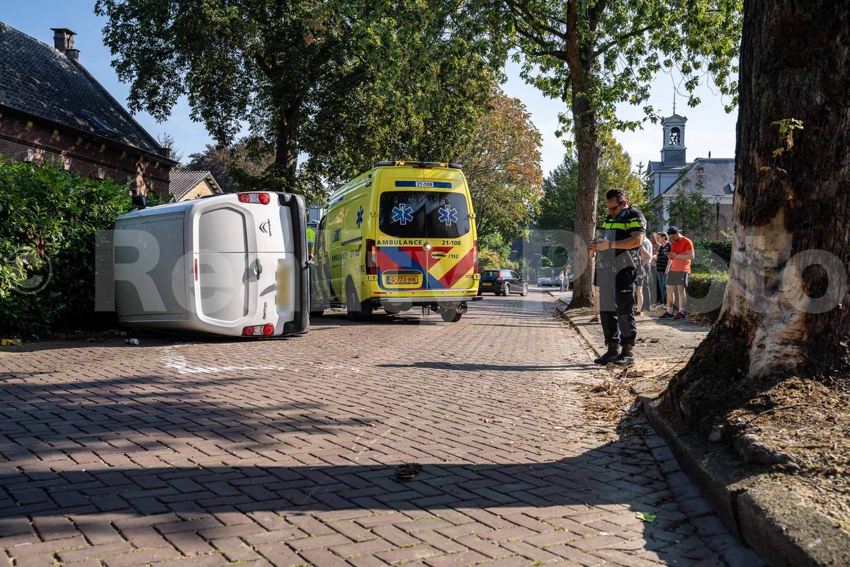 De wagen kwam daarna op de zijkant terecht. De bestuurder van de bestelauto ging er na het ongeval vandoor. Hij kon later in de omgeving worden aangehouden door de politie..