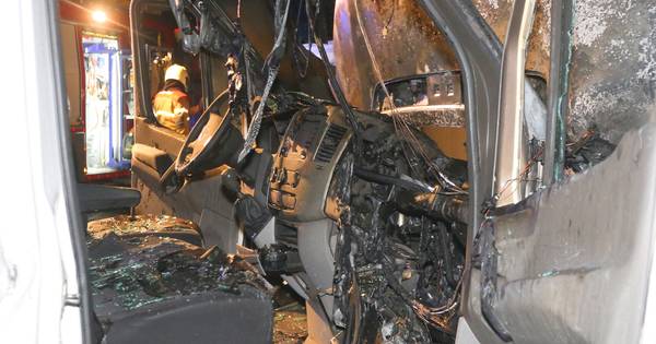 Toen de brandweer aankwam, stond de voorkant van de bestelbus volledig in brand.