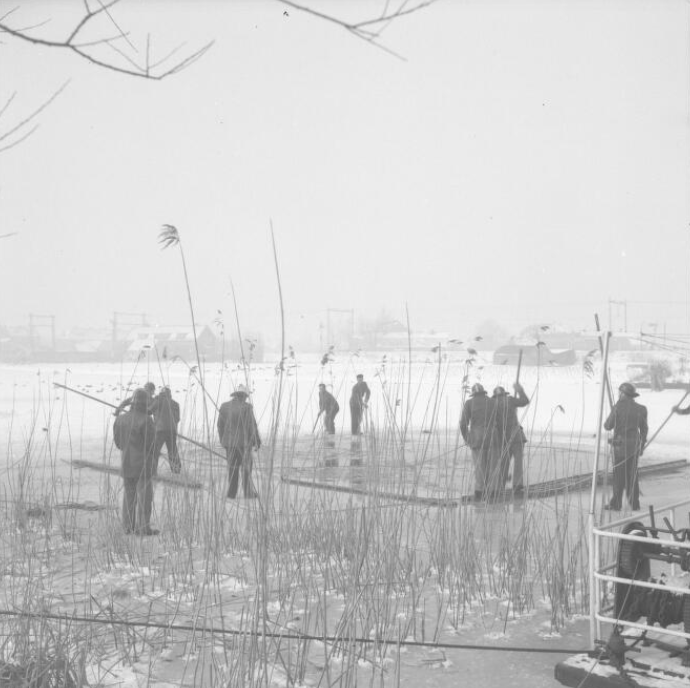 17 februari 1956: De Leidse brandweer hakt een grote bijt in het ijs bij de Vink in de Rijn om de watervogels voor ondergang te behoeden (foto: B. van Vliet).