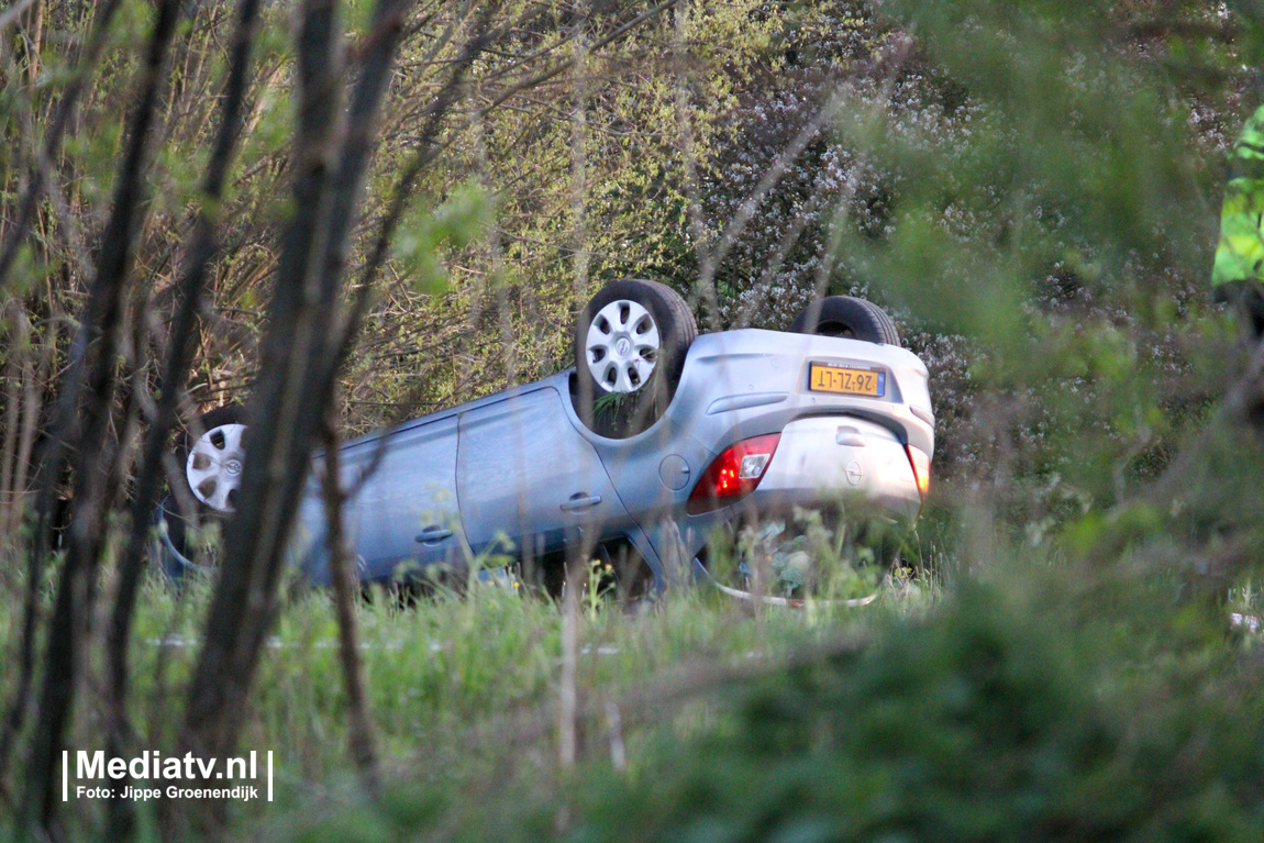 De auto raakte van de weg en belandde op zijn dak in de berm. Een ambulance en de politie kwamen ter plaatse..