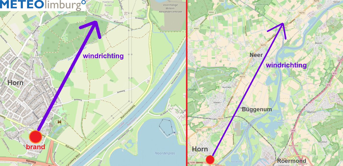 : rook gaat met een stevige vrij krachtige wind uit ZZW over het uiterste oosten van Horn (kerk eo). Brandlucht oa te ruiken tot in Kessel-Eik..