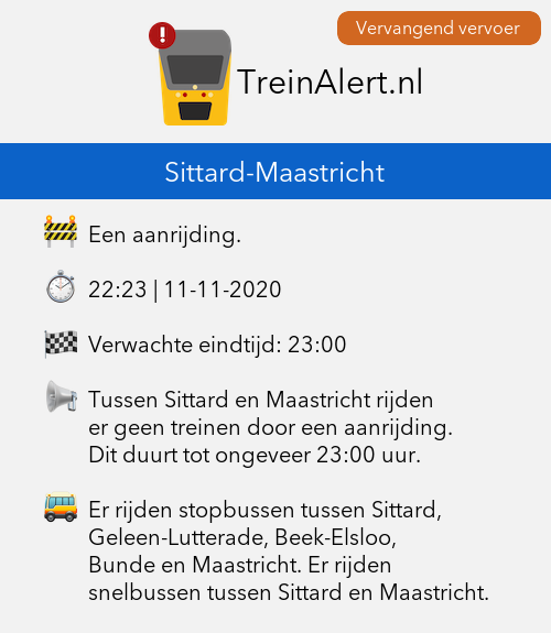 Tussen Sittard en Maastricht rijden er geen treinen door een aanrijding.