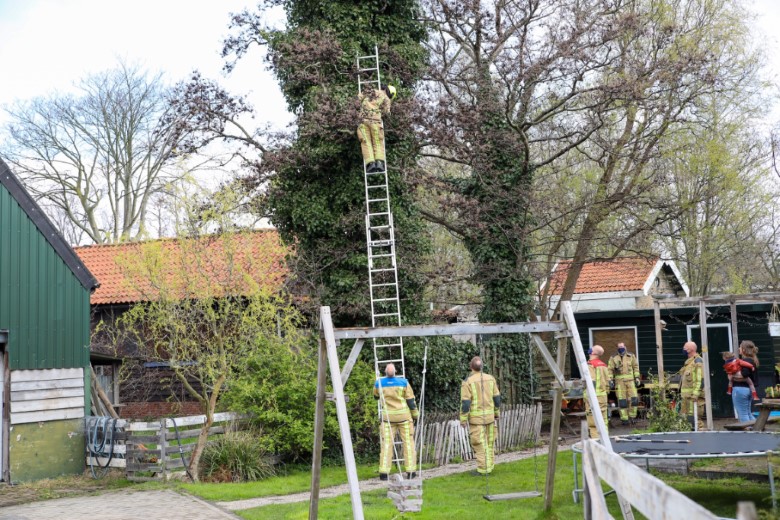 De brandweer kwam donderdagochtend wederom kijken of ze het beestje kon redden, maar de boom was te hoog voor een ladder. Woensdag had de brandweer ook al een poging gedaan om het beestje te bevrijden, maar zonder resultaat. Vandaag werd de hoogwerker van de brandweer van Delft erbij gehaald.