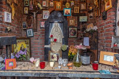 De meeste bidprentjes en foto’s die de brand overleefden, hangen weer op hun plek. Van de dader ontbreekt ieder spoor.