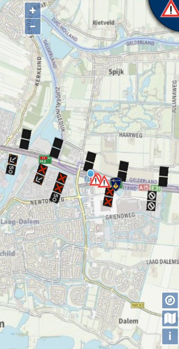 | Ongeval op de #a15 thv #Gorinchem oost/#arkel, de weg is afgesloten in de richting van Nijmegen. (beeld via @wegstatus).
