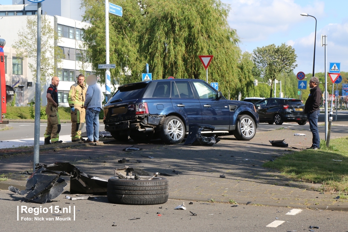 De klap was kennelijk zo hard, dat een wiel van de Range Rover finaal is afgebroken. Er lagen diverse onderdelen op het wegdek.