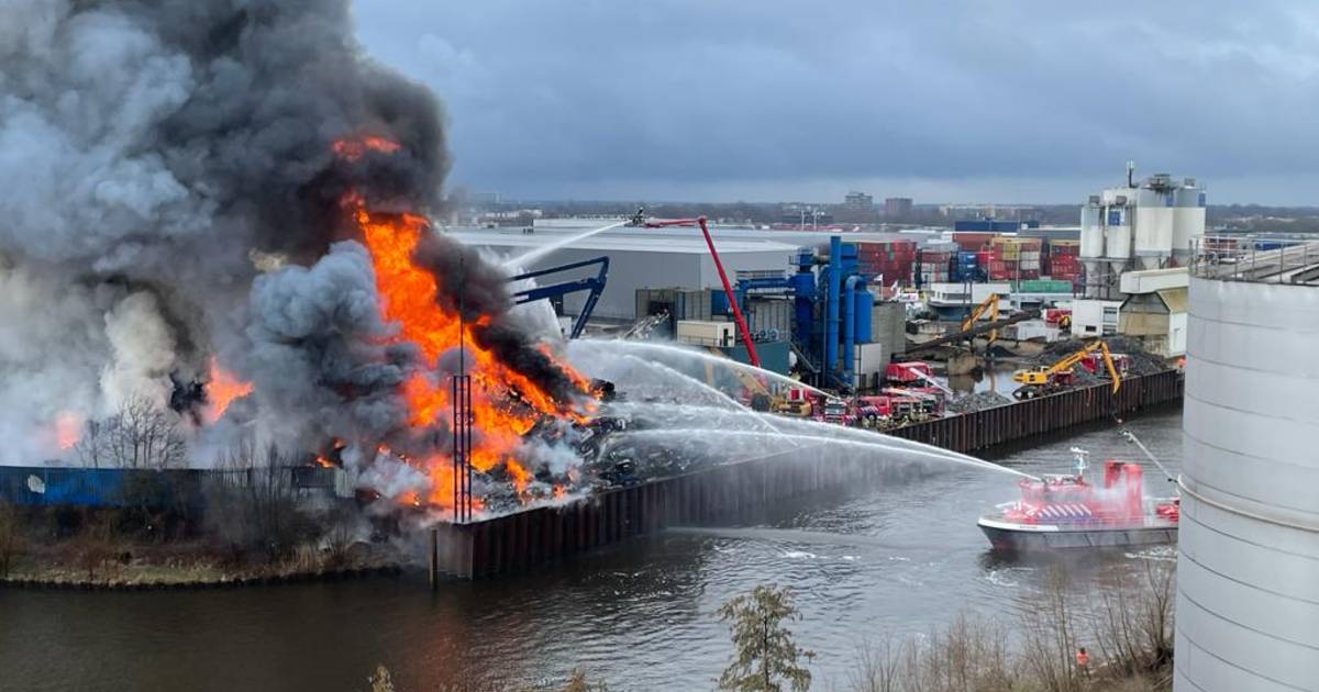 De vlammen zijn 25 meter hoog. Tientallen brandweermensen blussen, onder meer vanaf boten. .