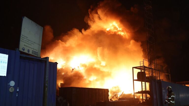 De brand zorgt voor een enorme vuurzee. Vlammen slaan zo'n twintig meter de lucht in. Een berg ijzer- en metaalafval met een oppervlakte van zo'n honderd bij honderd meter staat in brand, laat een woordvoerder van de brandweer weten.
