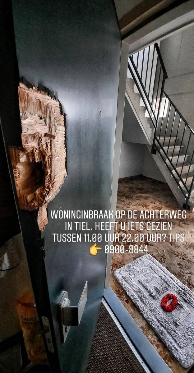 #WONINGINBRAAK Op woensdag 9 december tussen 11.00 en 22.00 uur werd er ingebroken bij een appartementencomplex aan de Achterweg in #Tiel. Tips ?? 0900-8844.