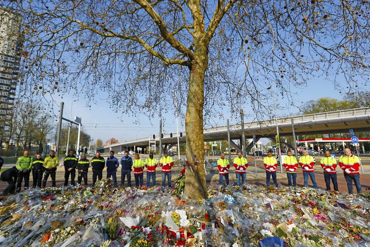 De bloemenzee op het 24 Oktoberplein, waar massaal bloemen, knuffelbeesten, kaarten, tekeningen en kaarsen neer hebben gelegd na de aanslag in een tram op 18 maart.