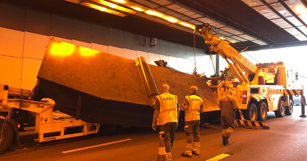 In de Kennedytunnel zijn deze middag twee van de drie rijstroken richting Nederland versperd geraakt nadat een tien meter lange, zware ijzeren constructie van een uitzonderlijk transport was geschoven en op de rijbaan was terechtgekomen.