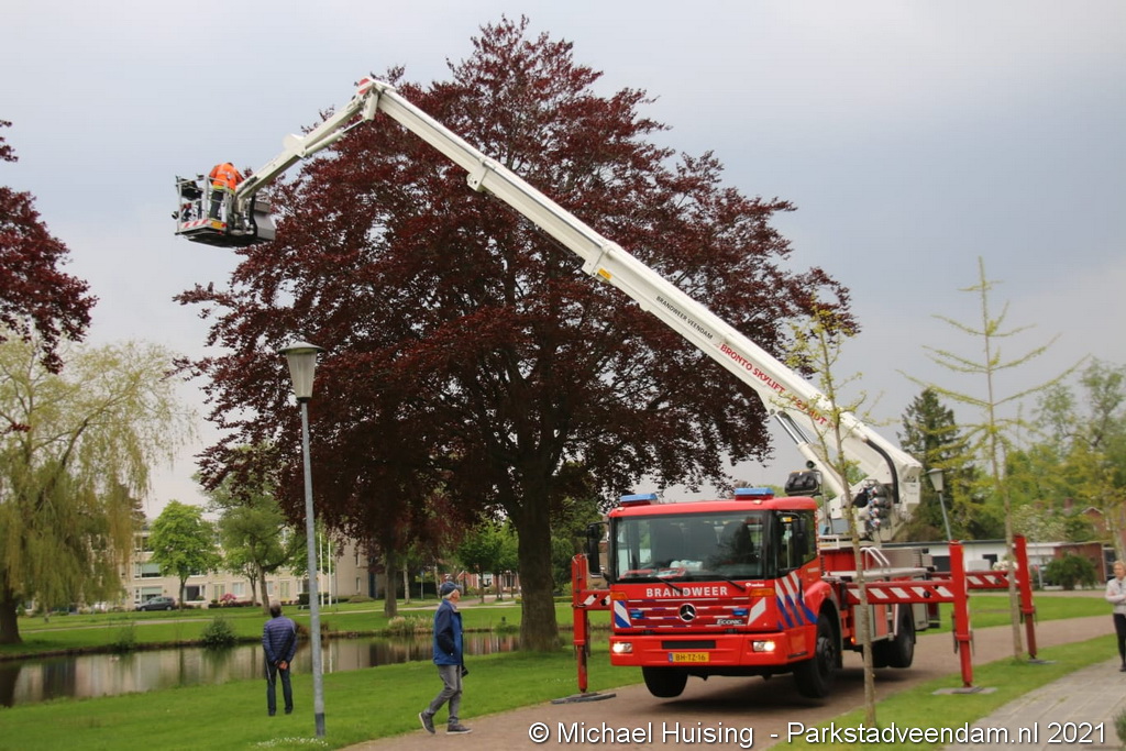 Donderdagavond heeft de brandweer van Veendam een gewonde Vlaamse gaai uit een boom gehaald aan de Wilhelminasingel.