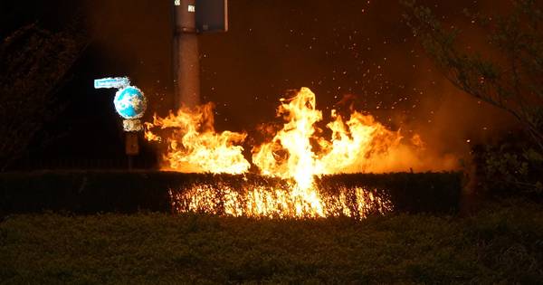 SPRANG-CAPELLE - Een groot deel van de struiken op de rotonde van de Spoorbaanweg en Noorder Allee in Sprang-Capelle is in de nacht van donderdag op vrijdag in vlammen opgegaan.