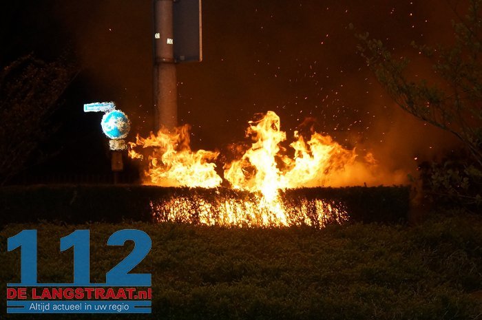 Een groot deel van de struiken op de rotonde van de Spoorbaanweg en Noorder Allee in Sprang-Capelle is in de nacht van donderdag op vrijdag in vlammen opgegaan.