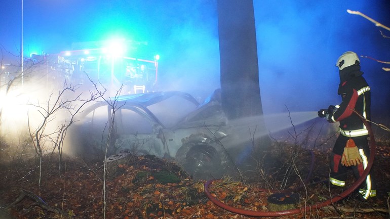 De auto reed aan de Stroovledder tegen een boom en vloog in brand...