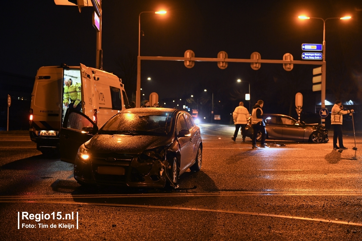 Rond half elf kwamen twee auto's met elkaar in botsing op het punt waar de Wippolderlaan, Westlandroute (vm. Veilingroute) en de Wateringseveldweg bijeen komen.