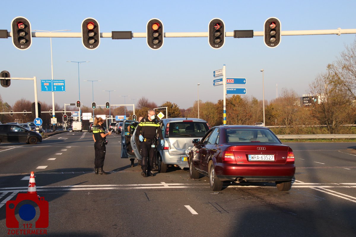 Dit na een kop-staart aanrijding voor de verkeerslichten. Er is na behandeling één persoon zonder spoed naar het ziekenhuis vervoerd. Beide voertuigen hebben forse schade opgelopen..