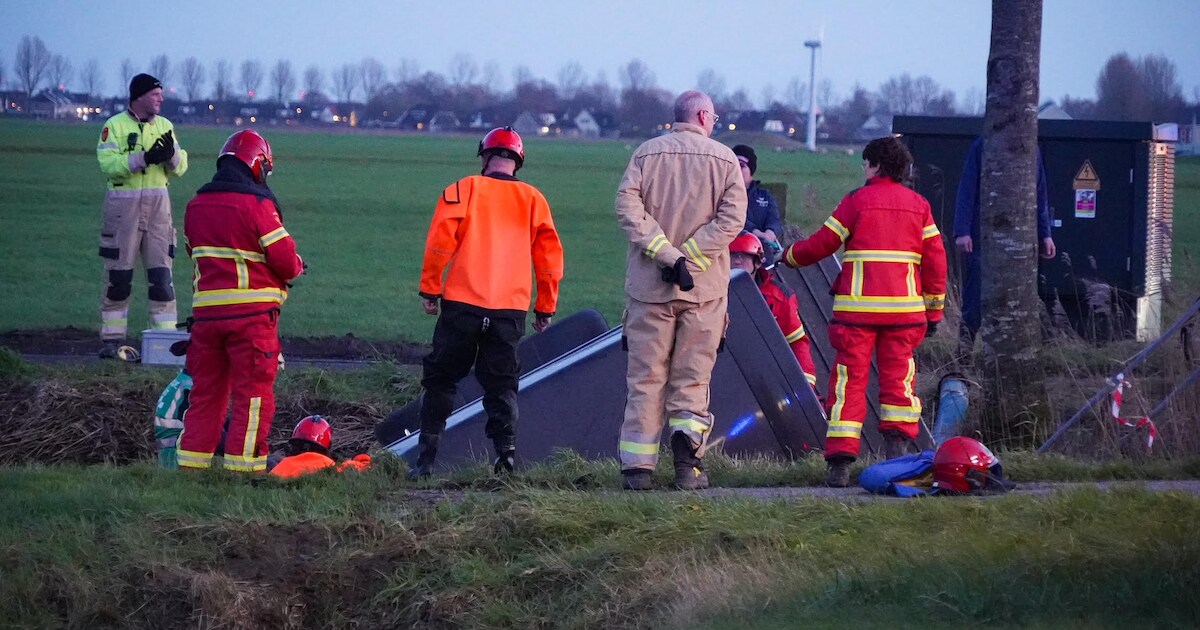 Het paard zal zich ongetwijfeld een hoedje zijn geschrokken toen vrijdagmiddag zijn trailer van de weg raakte en in en sloot reed langs de Boersterweg in Sint Annen. Brandweermensen gaan het dier uit de trailer redden.