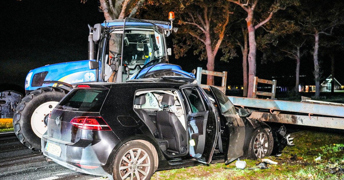 Een automobilist is vrijdagavond met een oplegger van een tractor in botsing gekomen op de N854 bij Wachtum. De auto raakte enorm beschadigd door de botsing.